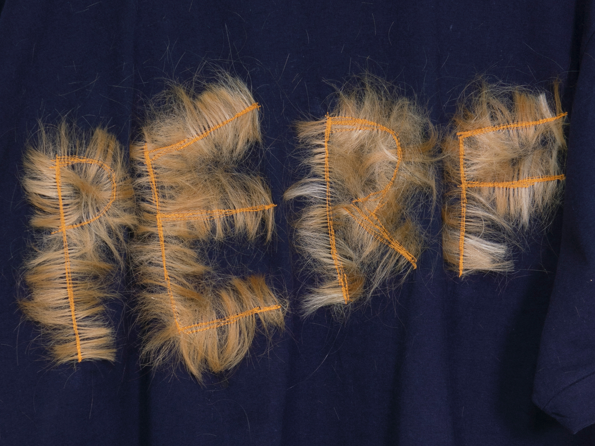 SWITCHER t-shirt (size L, orange), lettering with my own natural hair, sewn on, wire coat hanger, hand bent
