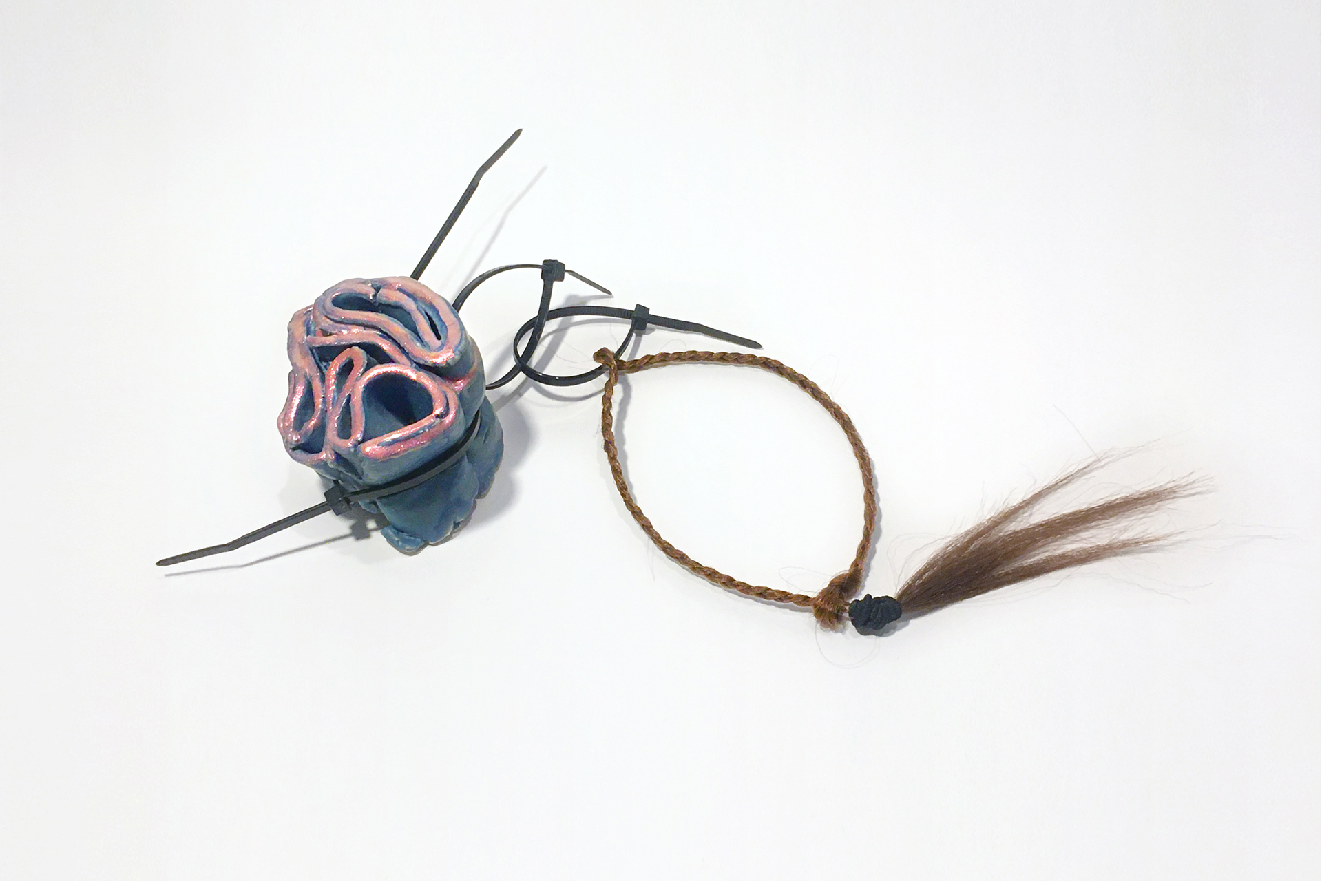 Ceramic, glaze, nail polish, cable ties, synthetic hair, hair tie